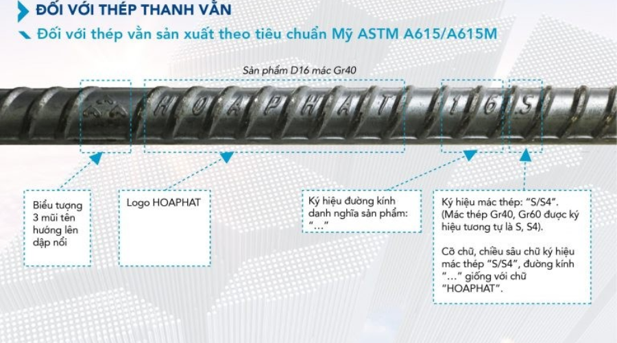 - Trên thân thép thanh vằn, ký hiệu 3 hình mũi tên được in nổi và xếp thành hình tam giác. Tiếp đến, dòng chữ “Hòa Phát” được in nổi trên thanh thép (mỗi ký tự là một vằn thép) cùng thông số đường kính và ký hiệu mác thép.