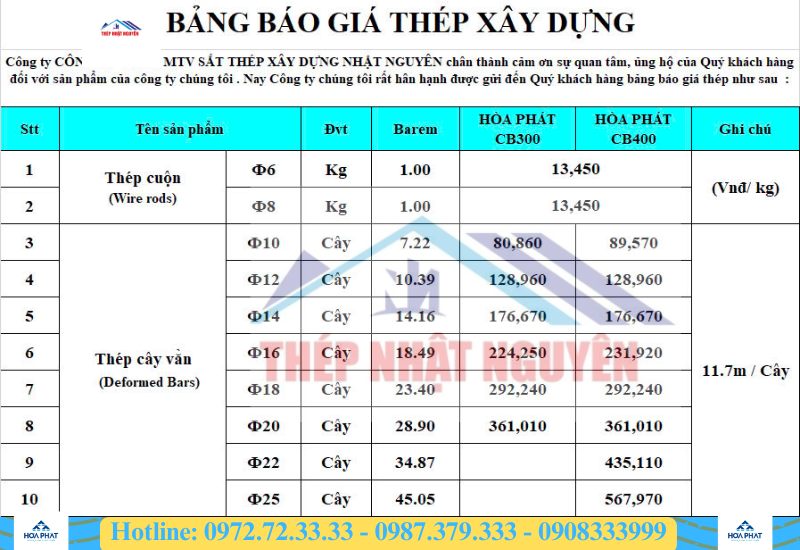 Dưới đây là bảng giá tham khảo xây dựng Hòa Phát cập nhật ngày 09/08/2025. Giá có thể thay đổi tùy theo khu vực, số lượng đặt hàng và các yếu tố thị trường.