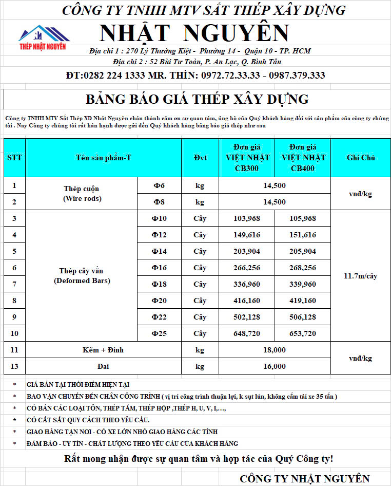 Lưu ý: Giá có thể thay đổi tùy theo biến động của thị trường. Vui lòng liên hệ với Thép Nhật Nguyên để nhận báo giá chính xác và ưu đãi tốt nhất.