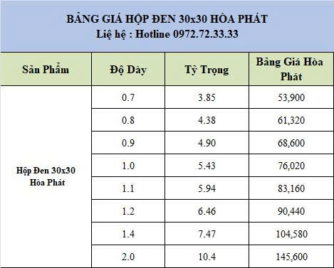 BẢNG GIÁ THÉP HỘP 30X30 ĐEN HÒA PHÁT