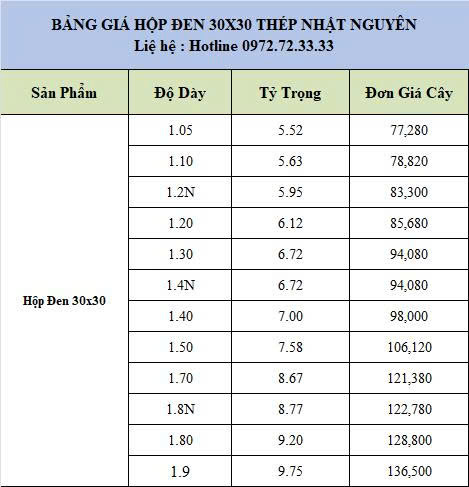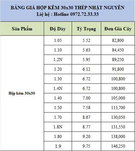 Lưu ý: Giá thép hộp 30x30 có thể thay đổi theo thời điểm, số lượng đặt ong và vị trí giao ong. Để nhận báo giá chính xác, vui lòng liên hệ Thép Nhật Nguyên qua hotline: 0972.72.33.33