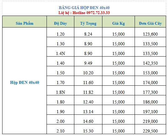 Bảng giá thép hộp 40x40 theo loại (đen, mạ kẽm)