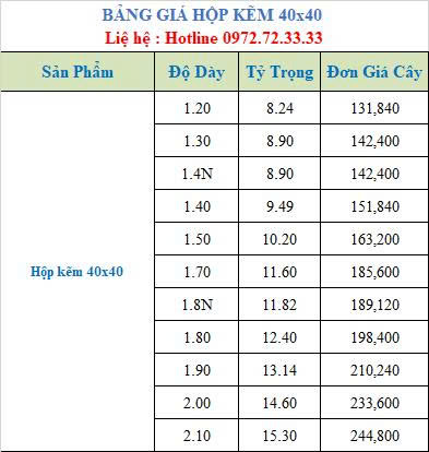 Lưu ý: Giá thép hộp 40x40 có thể thay đổi tùy thuộc vào thời điểm mua, số lượng, thương hiệu và thị trường. Để nhận báo giá chính xác, vui lòng liên hệ Thép Nhật Nguyên qua hotline: 0972.72.33.33